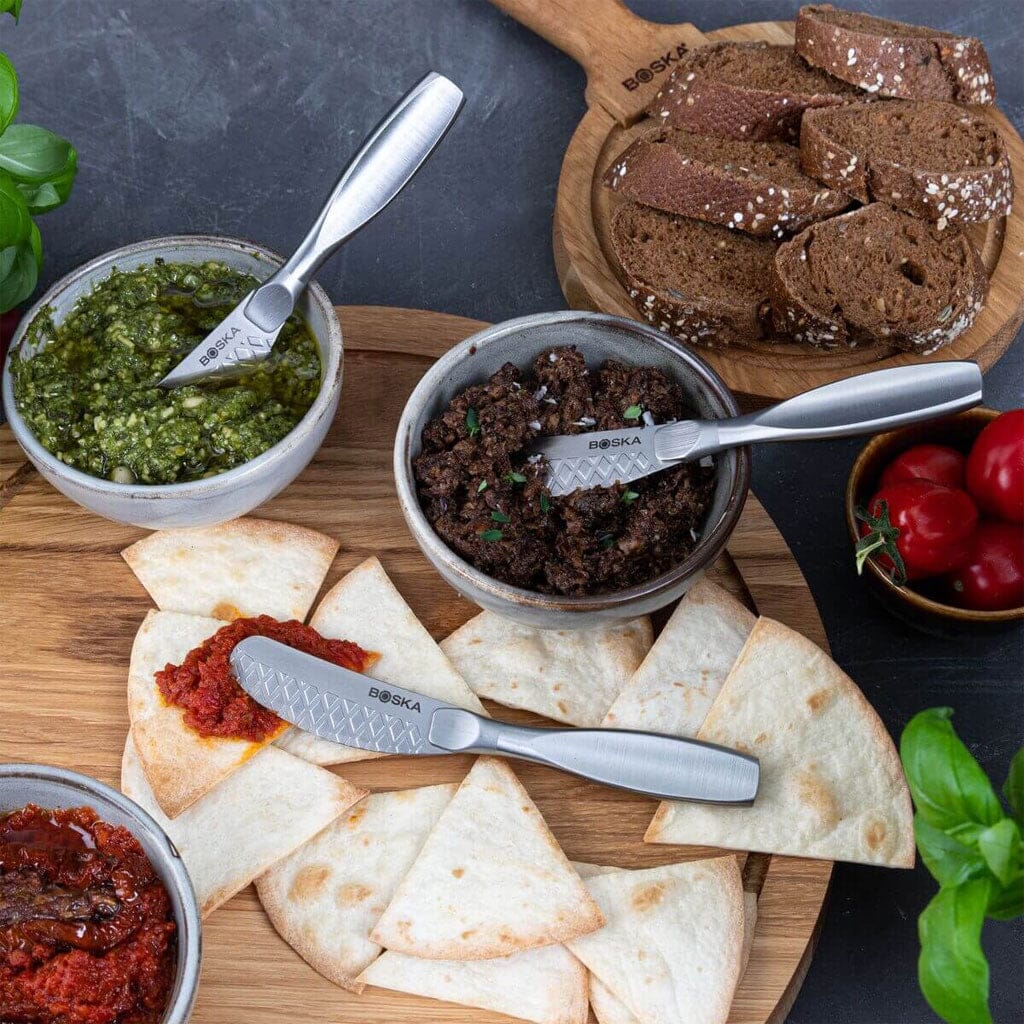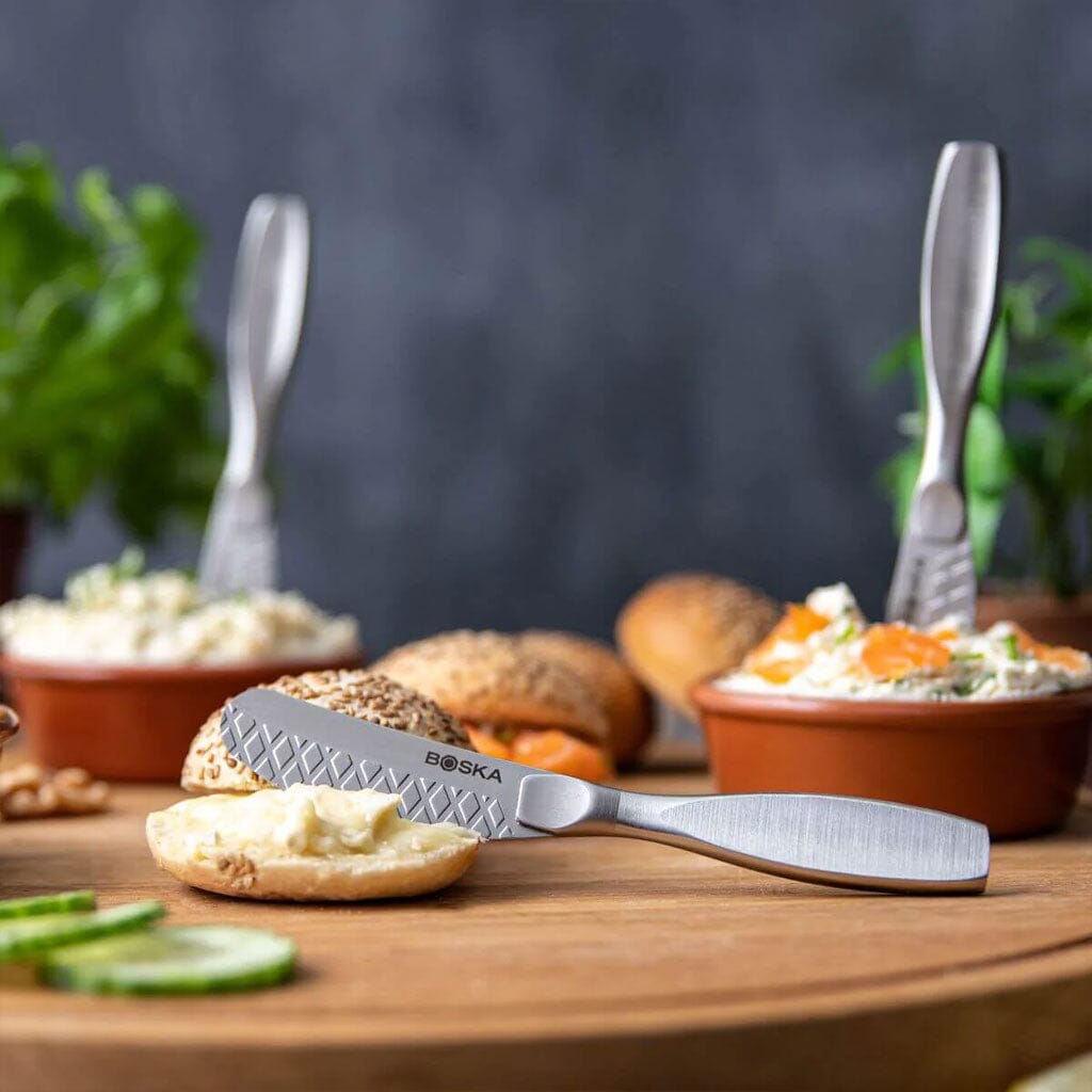Agregue artesanía y estilo a su mesa de desayuno o recepción de bebidas: ¡pida los cuchillos para untar pequeños Boska Monaco+ y disfrute de untables perfectamente untables en todo momento!
