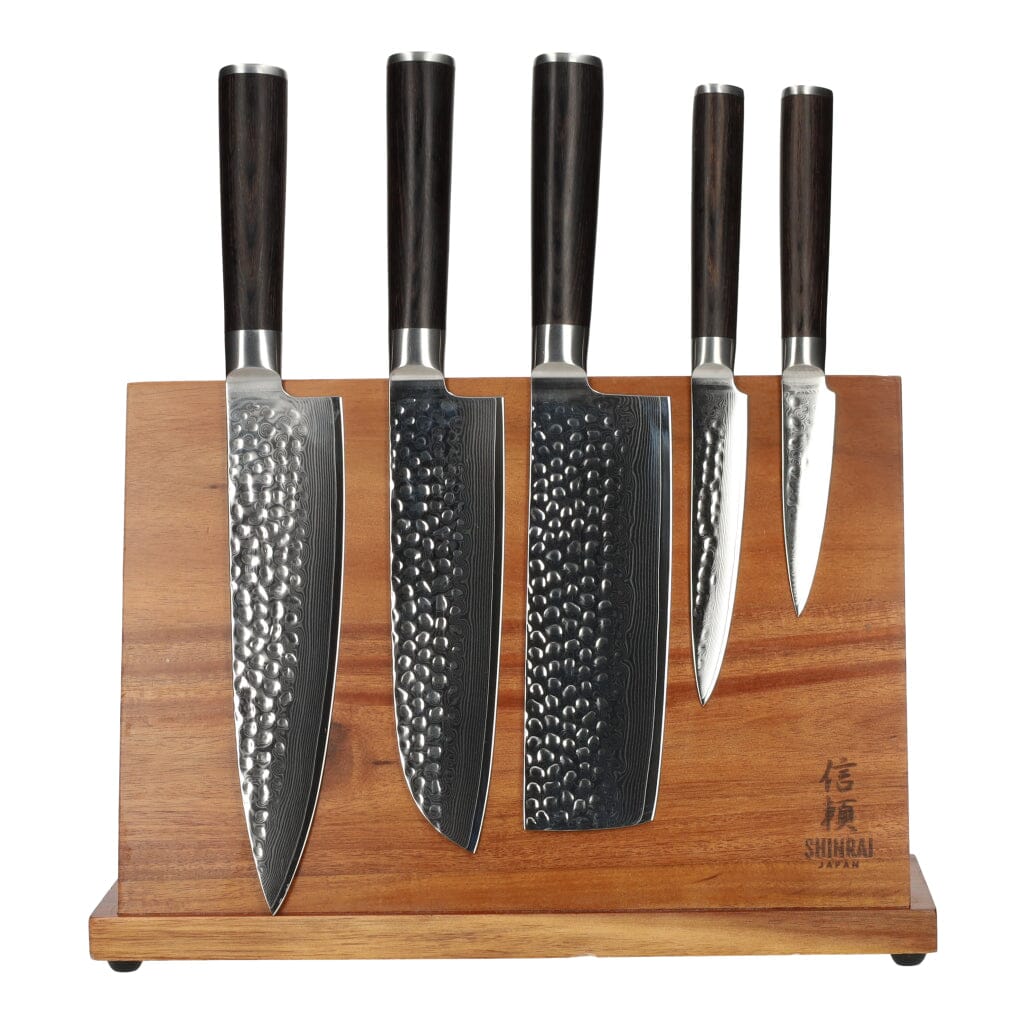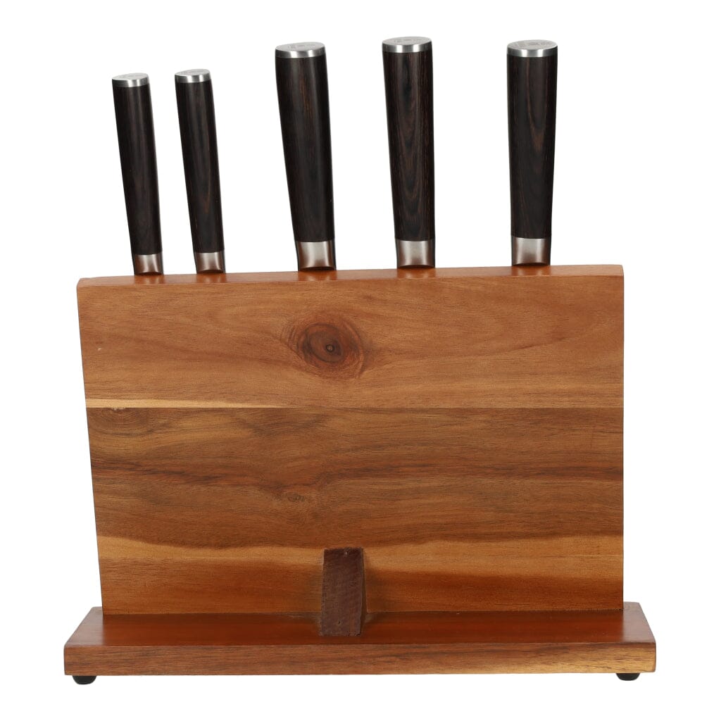 Este bloque de cuchillos de madera de acacia viene con 5 cuchillos de la serie Hammered Damast BR que son adecuados para diversas tareas de corte en la cocina. La combinación de mangos de madera de pakka y un taco de madera de acacia realmente hará que los cuchillos destaquen.